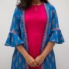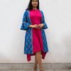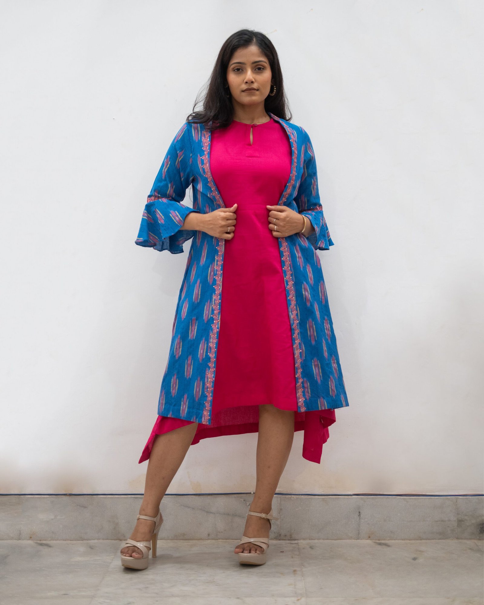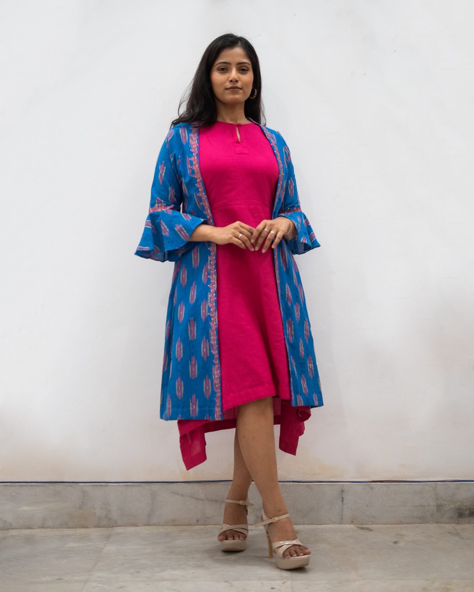 Elevate your style with this overlay jacket dress crafted from premium ikkat handloom textile in breathable linen fabric. The unique asymmetric pattern brings a modern twist, while the vibrant pink and blue colour combination adds effortless charm. Finished with hand-crafted embroidered borders, this piece blends tradition and contemporary design—perfect for statement making elegance.
