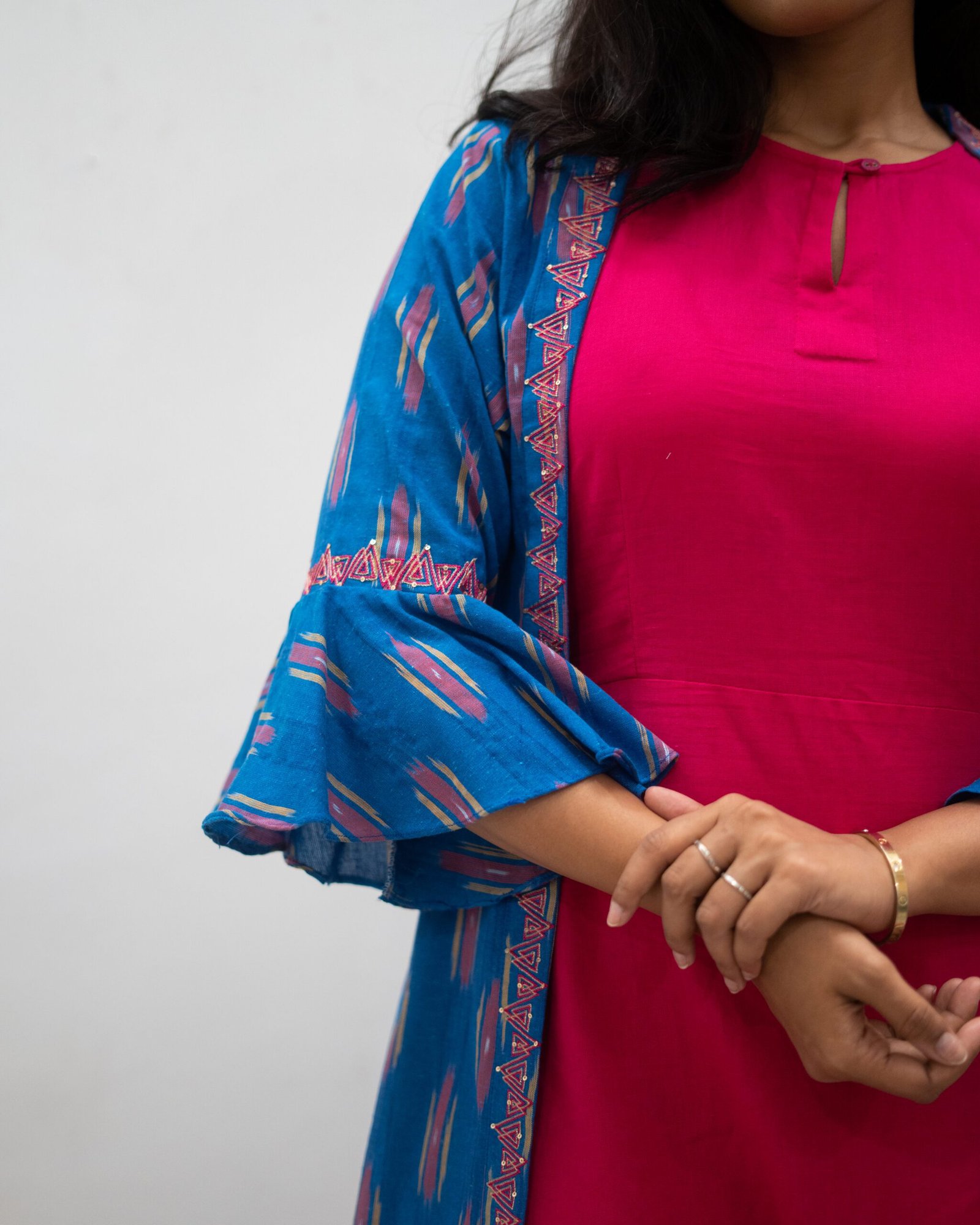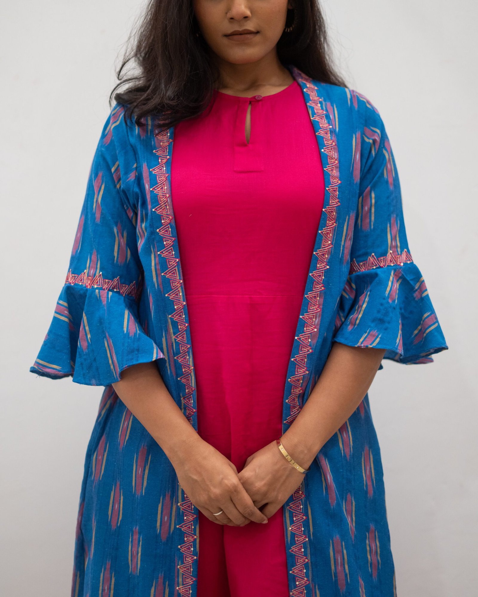 Elevate your style with this overlay jacket dress crafted from premium ikkat handloom textile in breathable linen fabric. The unique asymmetric pattern brings a modern twist, while the vibrant pink and blue colour combination adds effortless charm. Finished with hand-crafted embroidered borders, this piece blends tradition and contemporary design—perfect for statement making elegance.