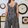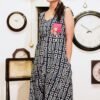 An antifit jumpsuit, with a front zipper for convenience in wearing and taking it off and the anti-fit silhouette for easy comfort and convenience over other jumpsuits. 2 pockets for added funtionality . This naturally dyed and hand block printed indigo colour jumpsuit is designed to easy grab and go and can be styled in multiple ways. hand katdana flowers add special touch as detailing creating a contrast to the entire garment.