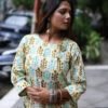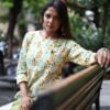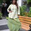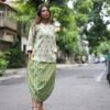 The dhoti co ord set is a beautiful pastel green shade with round neck and tassels in the neck as detailing. This outfit is an effortless outfit for any and every occasion. The dhoti skirt comes with back elastic to fit your waist and has 2 side pockets for addad convenience.